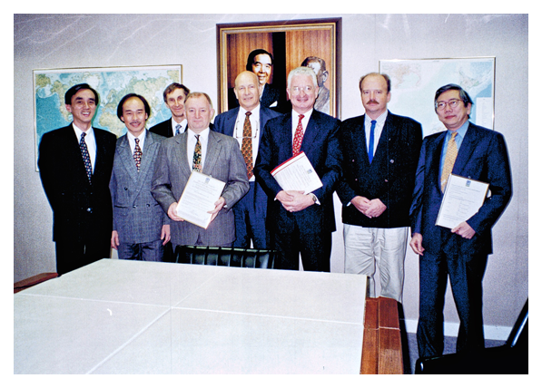 SEP-ISM Certificate presentation May 1995. (L-R: Matthew Wong, F.S. Cheng, Denis Keith, Bruce Ewen, Bill Codrington, Helmut Sohmen, Per-Arne Waløen (DNV) and Stephen Pan)